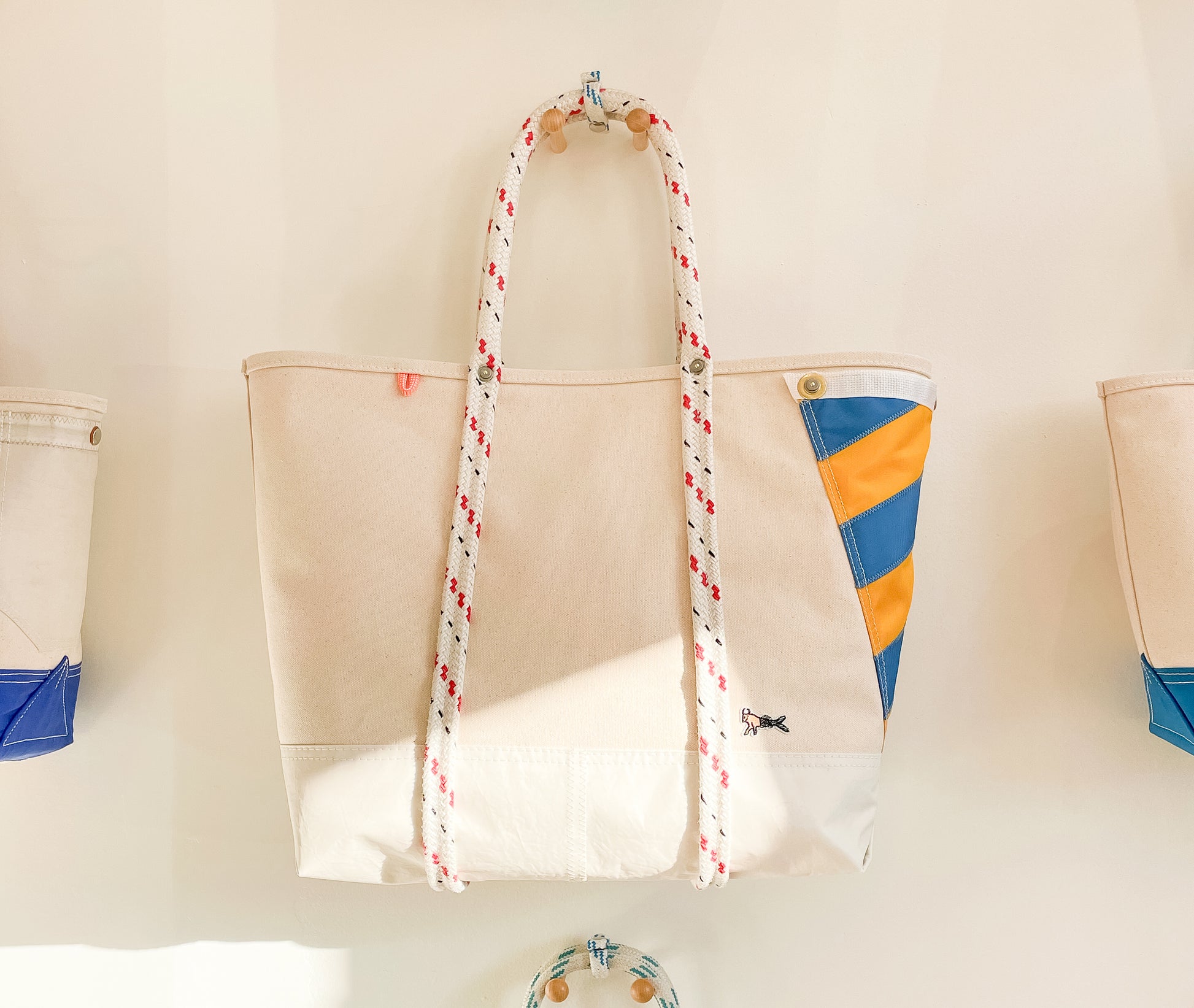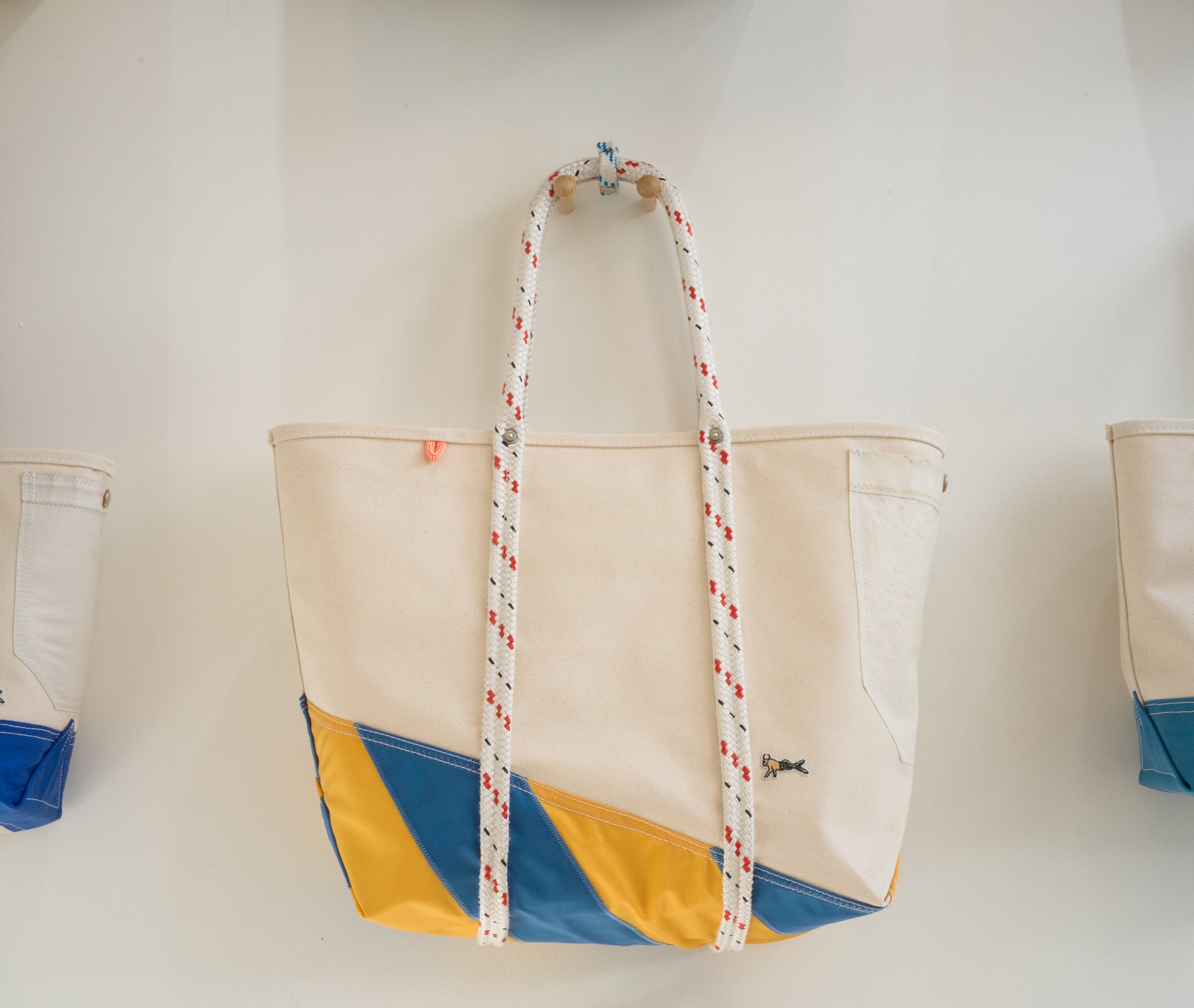 Constructed from heavy-duty #6 cotton duck canvas sailcloth, handmade and featuring fabrics from sails, bags and flags. The B&G Burgees used are recycled burgees from the Club fleet. The rope handles are made from repurposed yacht lines from B&G's own catamaran, Andromeda.